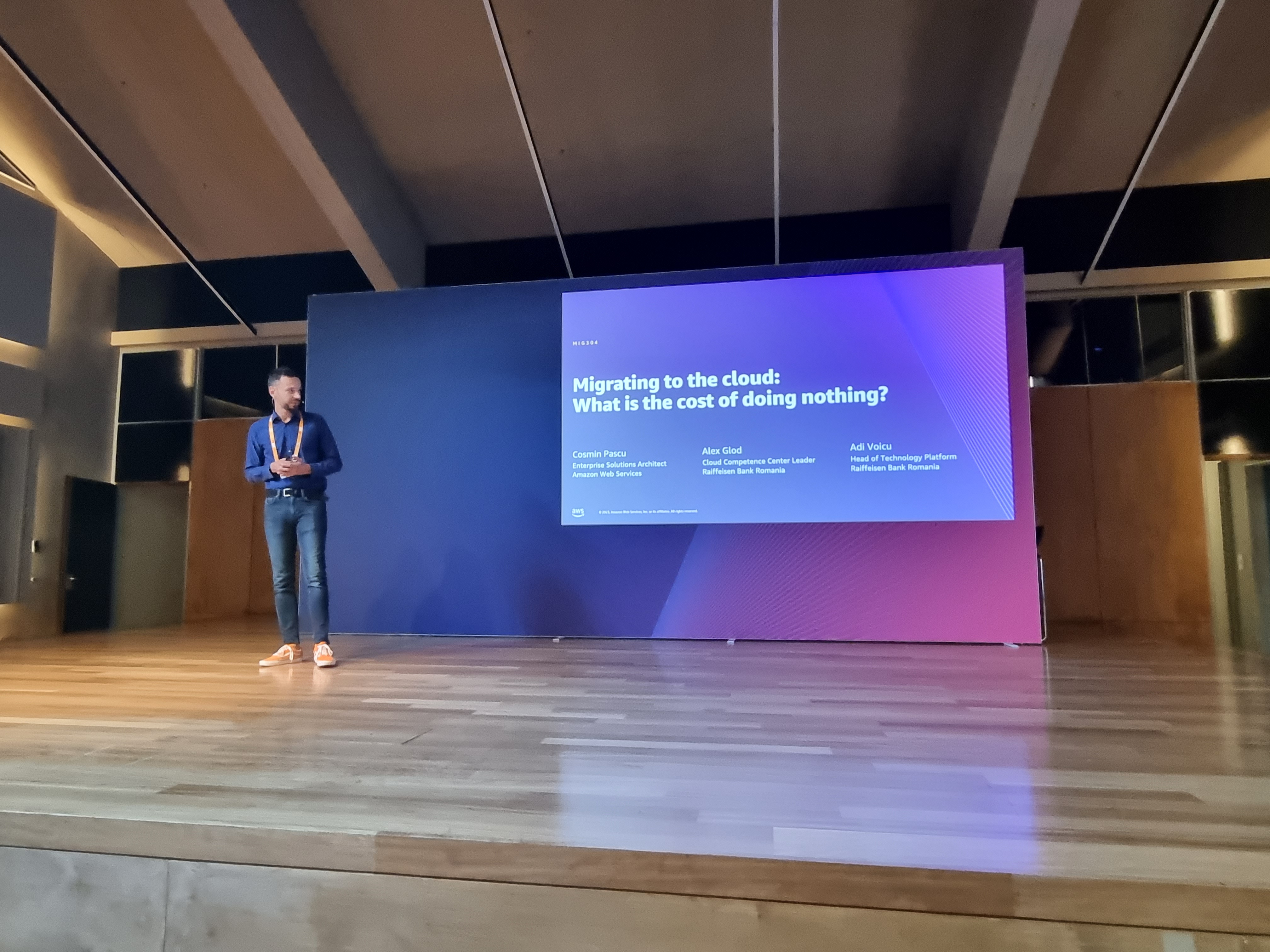 Another interesting session was “Migrating to the cloud: What is the cost of doing nothing?” where our very own Cosmin Pascu (Enterprise SA, AWS) was on stage with our client Raiffeisen Bank Romania’s Alex Glod (Cloud Competence Leader) and Adrian Voicu (Head of Technology Platform).
