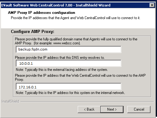 The first two fields are used by the agents to connect to your WebCC server and represent the DNS and corresponding IP address as seen from the agent.