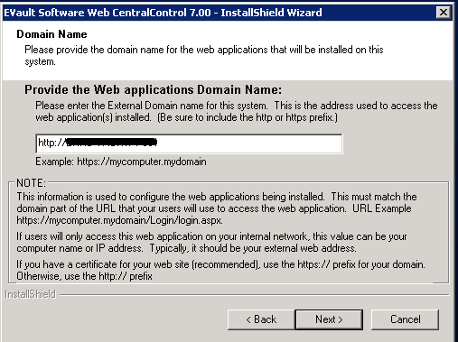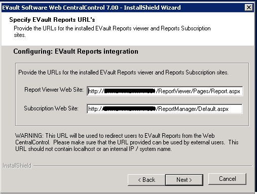 Note This assumes you have installed Web CentralControl and EVault Reports on the same server. If that is not the case the URLs would correspond to your WebCC installation.