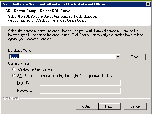 In the SQL Server Setup page, in the SQL Server box type (local) and select Connect using SQL Server authentication.