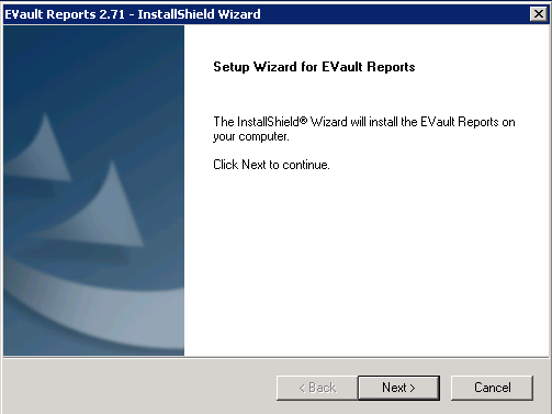 Run EVaultReports-2-71-1674a.exe.In the Welcome page click Next.