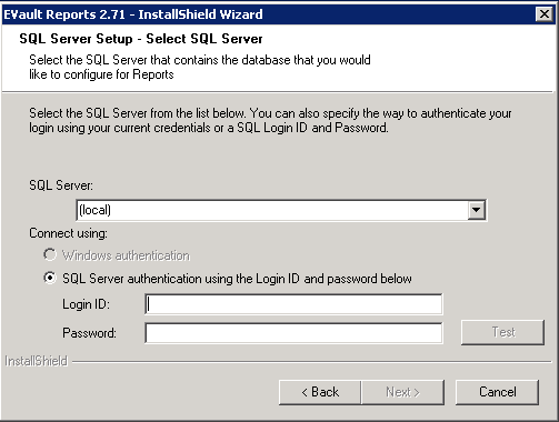 Type the credentials for the sa account or alternatively create a new SQL user account for the Evault Reports installation.