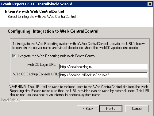 In the Web CC Login URL box type http://localhost/login. In the Backup console URL http://localhost/BackupConsole.