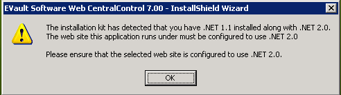 In order to install the latest version of Web CentralControl (7.00b) you will need a machine running Windows Server 2008 R2 with .Net Framework 3.5 SP1 installed.